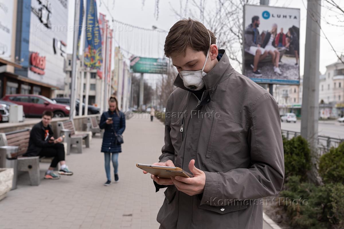 Меры предосторожности из-за опасности распространения коронавирусной инфекции COVID-19. Жанровая фотография. Молодой человек в медицинской маске со смартфоном в руке.