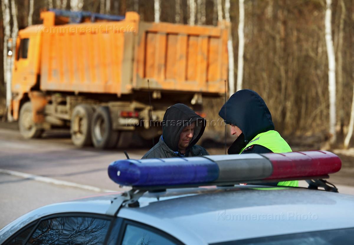Traffic police officers are seen on duty on Beloostrovsky highway. Traffic police officer issues a ticket to the heavy truck driver.