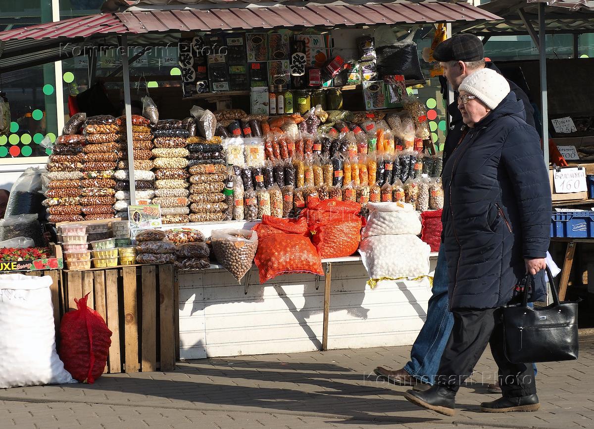 Виды Колпино во время карантина коронавируса COVID-19. Жанровая фотография. Покупатели на продуктовом рынке.