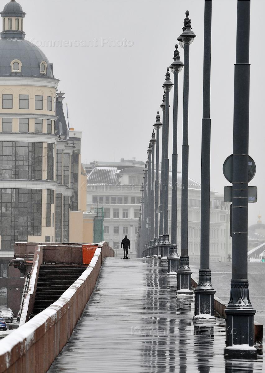Views of Moscow during coronavirus COVID-19 quarantine. Genre photo. Man walks along the empty Bolshoy Kamenny Bridge.