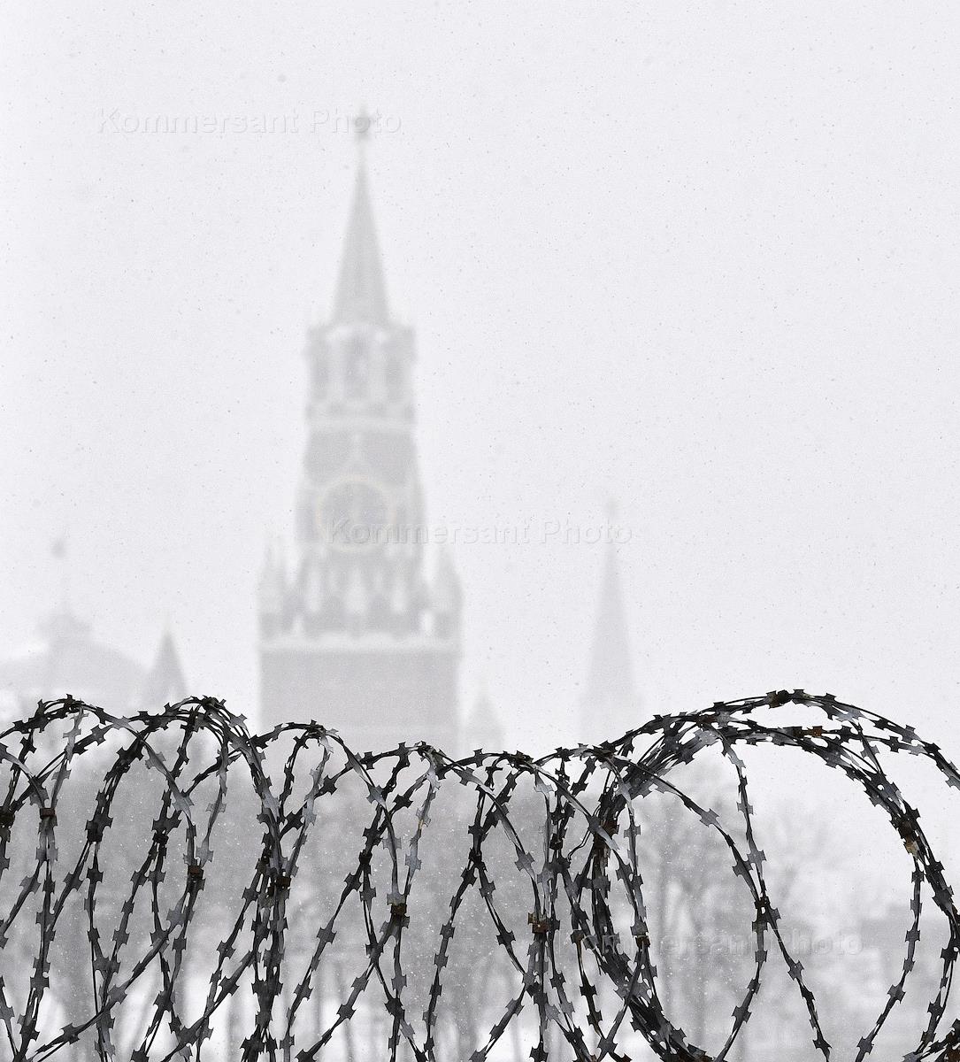 Виды Москвы во время карантина коронавируса COVID-19. Снегопад в городе. Жанровая фотография. Мотки колючей проволоки на фоне Спасской башни Кремля.