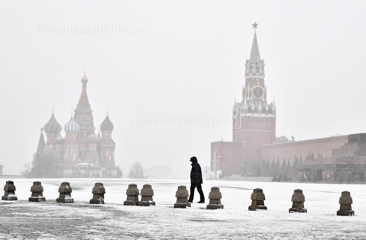 Views of Moscow during Coronavirus COVID-19 Quarantine. Snowfall in the city. Genre photo. Man wearing respirator mask walks along empty Red Square.