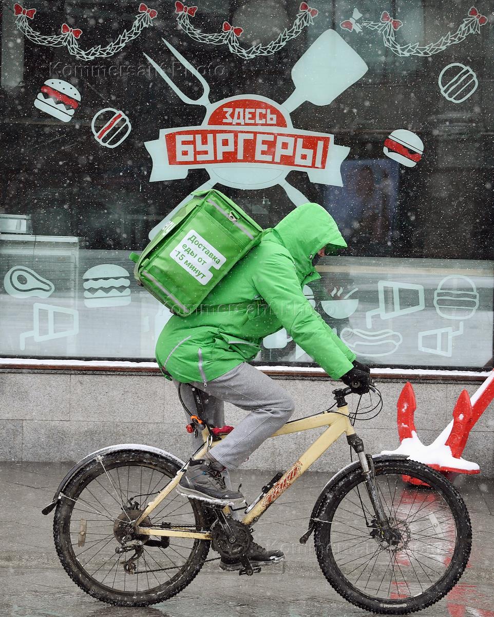 Виды Москвы во время карантина коронавируса COVID-19. Жанровая фотография. Курьер службы доставки еды Delivery Club на велосипеде.