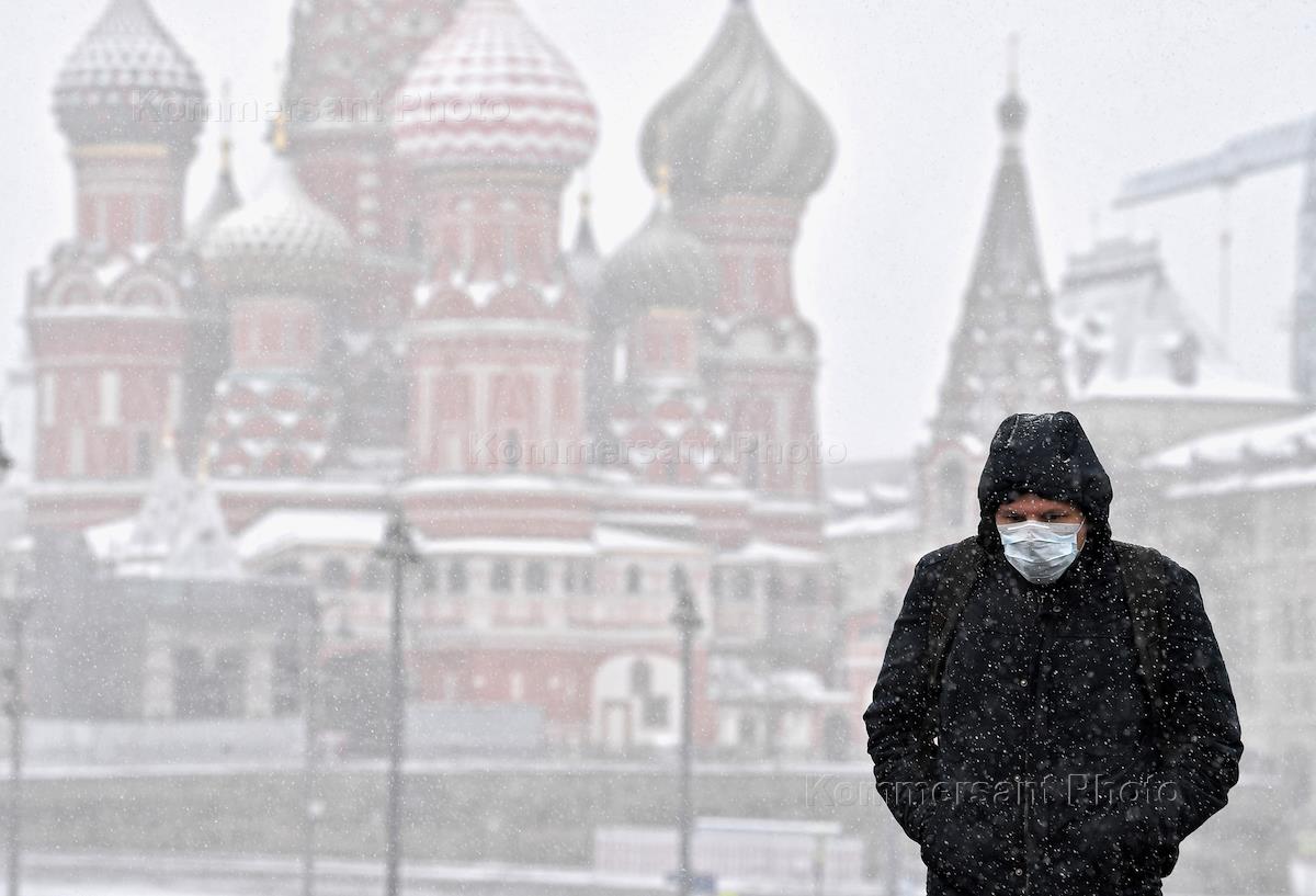 Виды Москвы во время карантина коронавируса COVID-19. Снегопад в городе. Жанровая фотография. Мужчина в медицинской маске-респираторе на пустой Красной площади.
