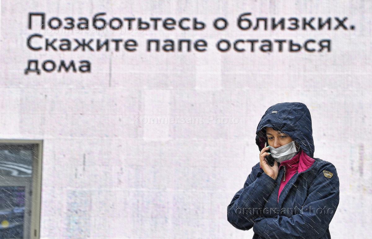 Views of Moscow during Coronavirus COVID-19 Quarantine. Genre photo. Information on coronavirus preventive measures, precautions and proper behavior during the quarantine ob the LED screen reading: "Avoid personal communication with older people. Better call them. S. Sobyanin."