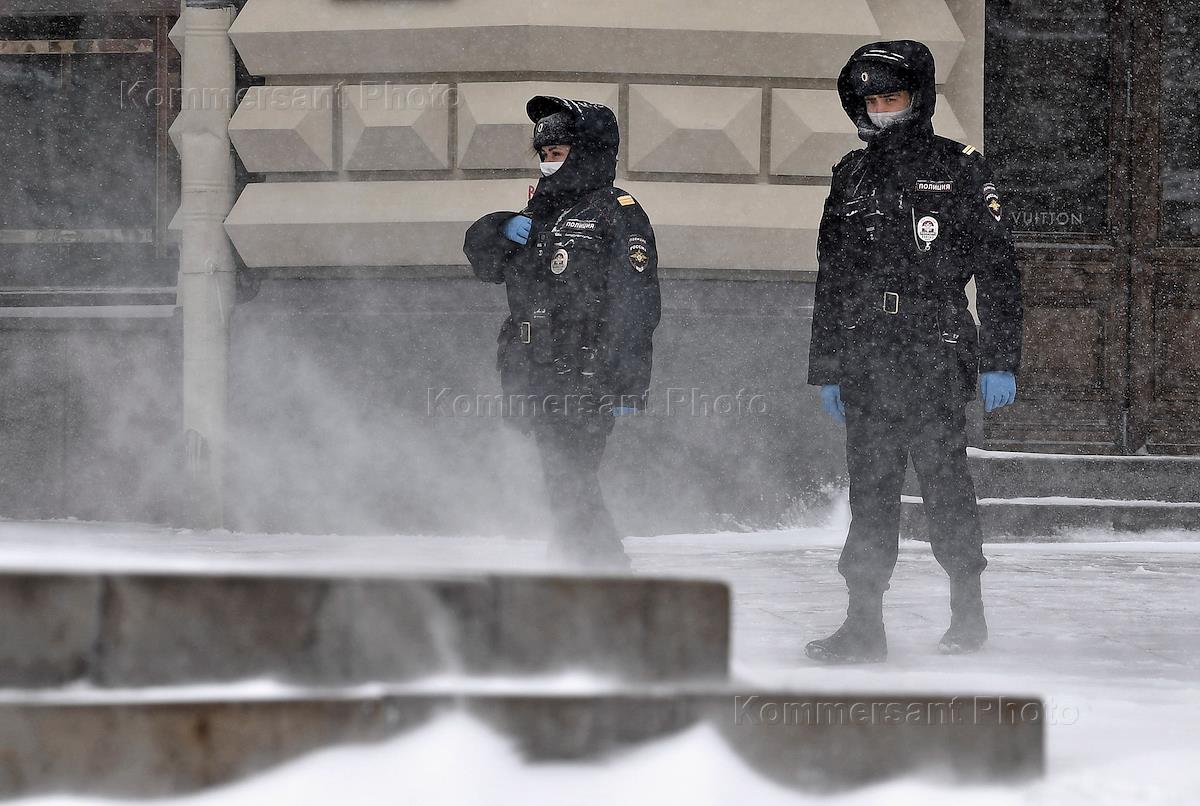 Views of Moscow during Coronavirus COVID-19 Quarantine. Snowfall in the city. Genre photo. Police officers are seen during street patrol near GUM.