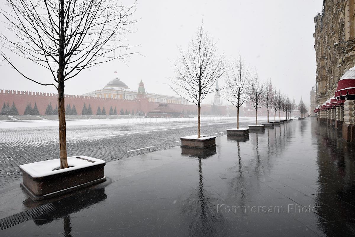 Виды Москвы во время карантина коронавируса COVID-19. Жанровая фотография. Пустая без людей Красная площадь.