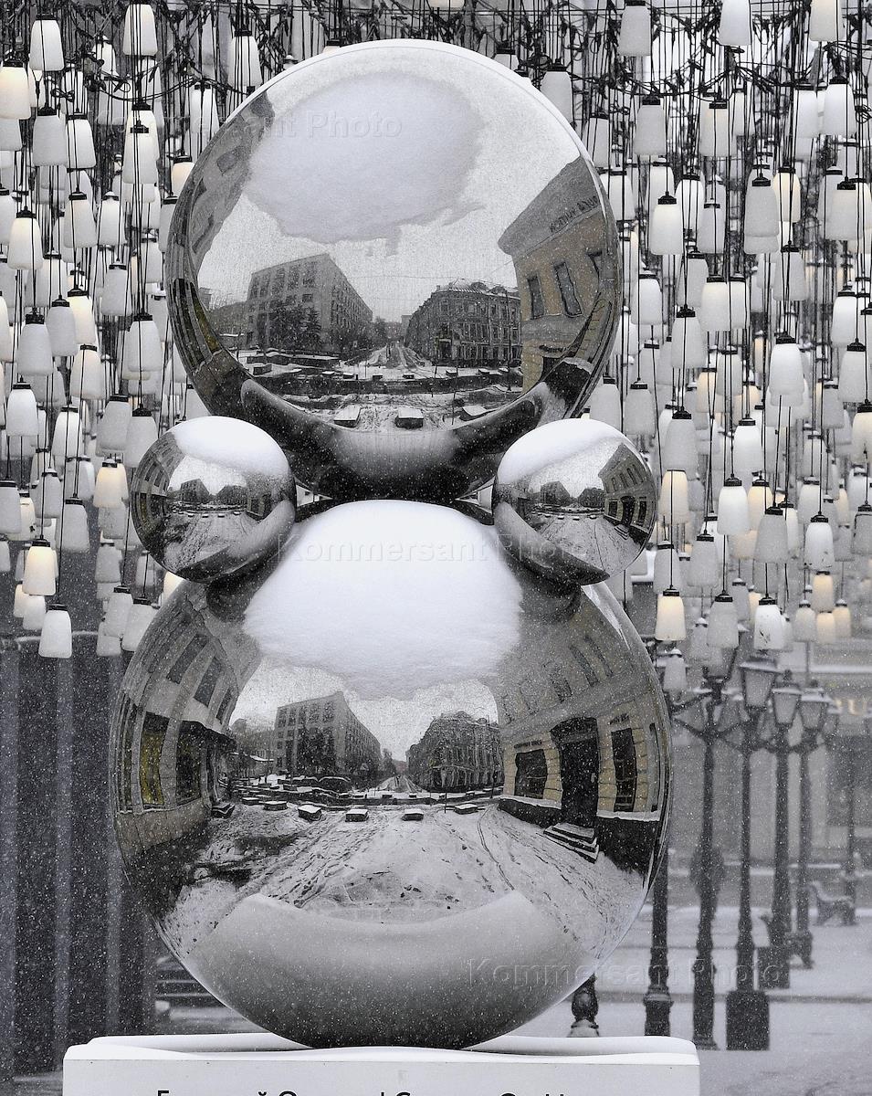 Виды Москвы во время режима самоизоляции из-за опасности распространения коронавирусной инфекции COVID-19. Жанровая фотография. Отражение Столешникова переулка в скульптуре художника Григория Орехова "Агата".