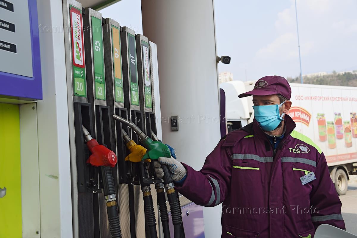 Views of Alushta during Coronavirus COVID-19 Quarantine. Gas station employee wearing face mask stands by the fuel filling column.