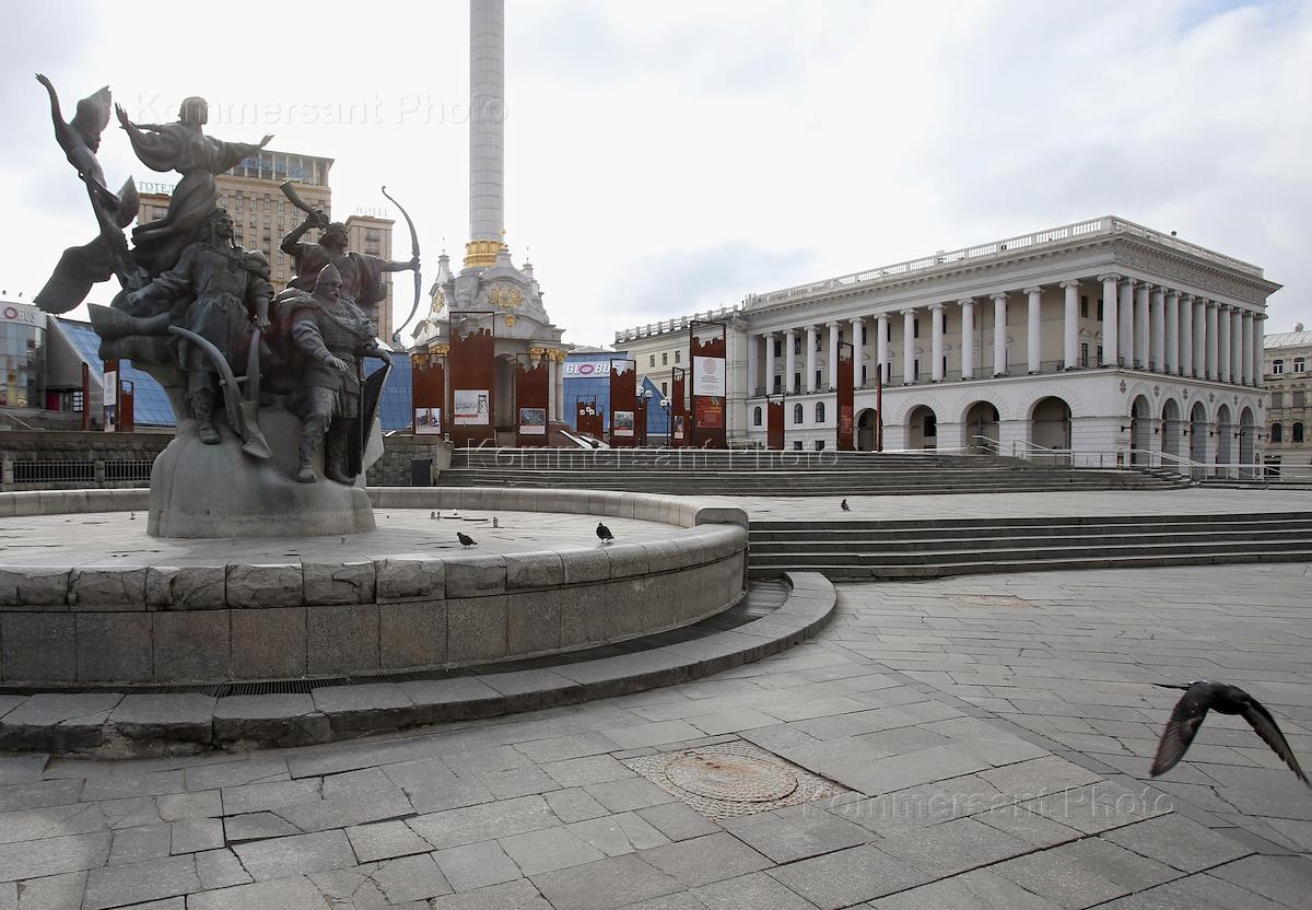 Виды Киева во время карантина коронавируса COVID-19. Пустая площадь Майдан Незалежности.