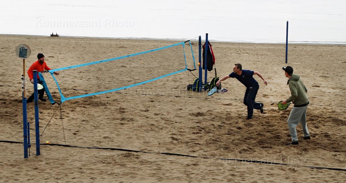 Views of Samara during Coronavirus COVID-19 Quarantine. Genre photo. Men play tennis on the promenade.