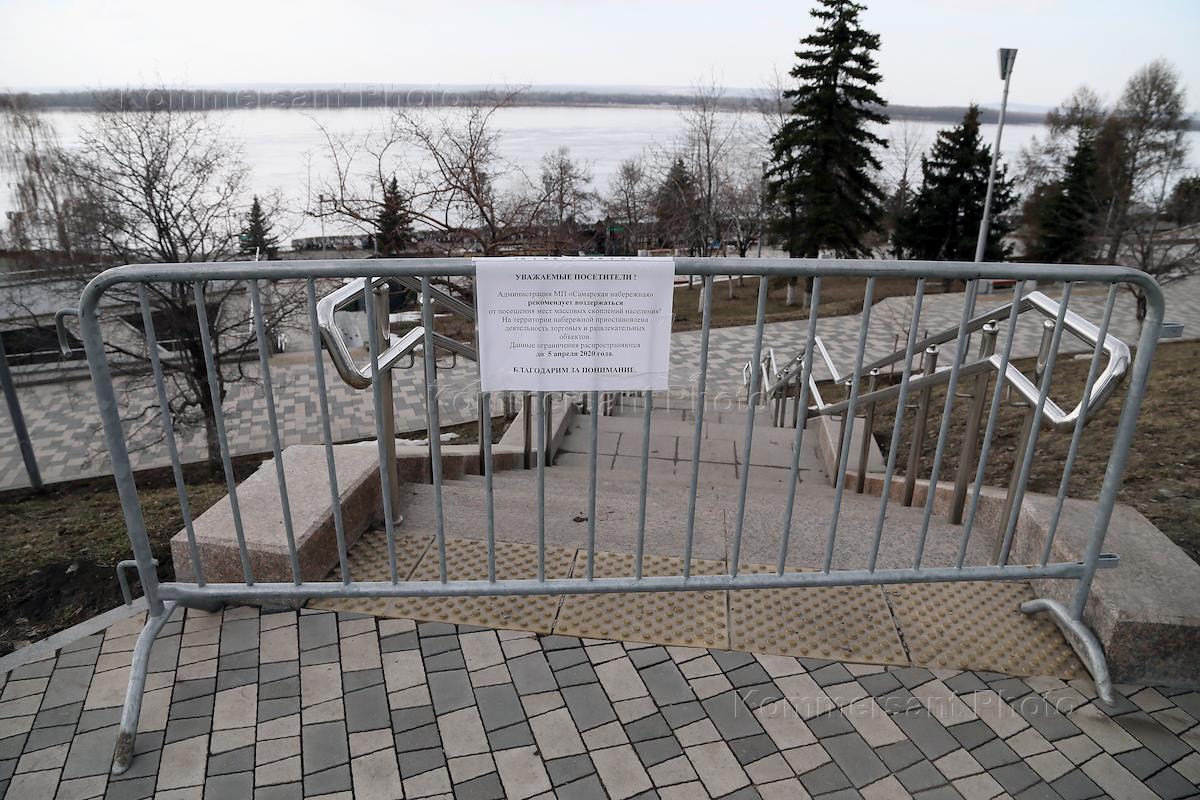 Views of Samara during Coronavirus COVID-19 Quarantine. Genre photo. Entrance to to the promenade blocked by the fence.