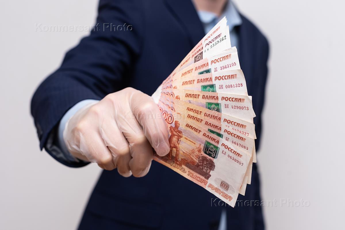 Жанровая фотография. Купюры достоинством 5000 рублей в руке мужчины в медицинской перчатке.