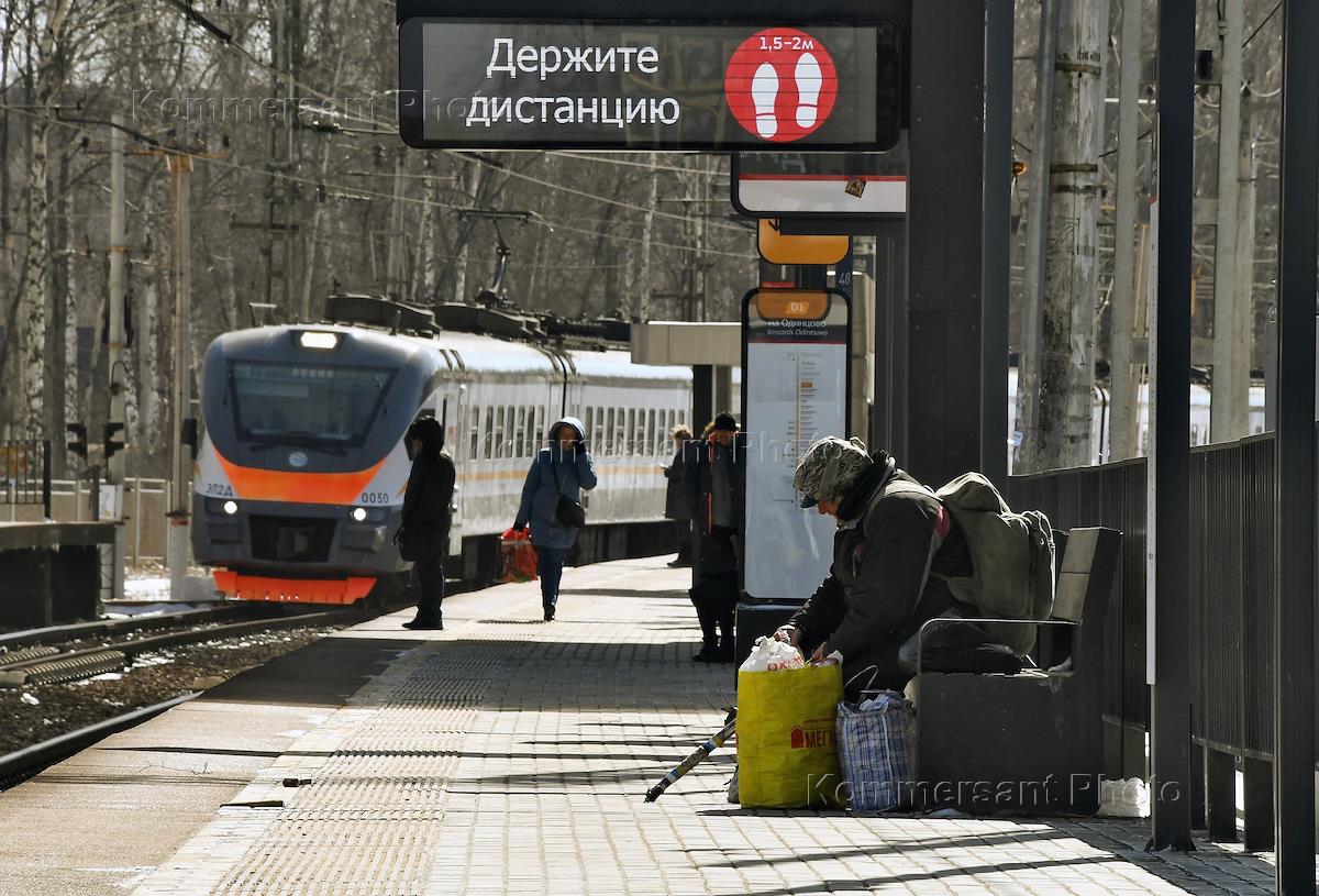 Preventive measures and precautions against coronavirus COVID-19. Genre photo. Passengers on the platform of the Vodniki railway station.
