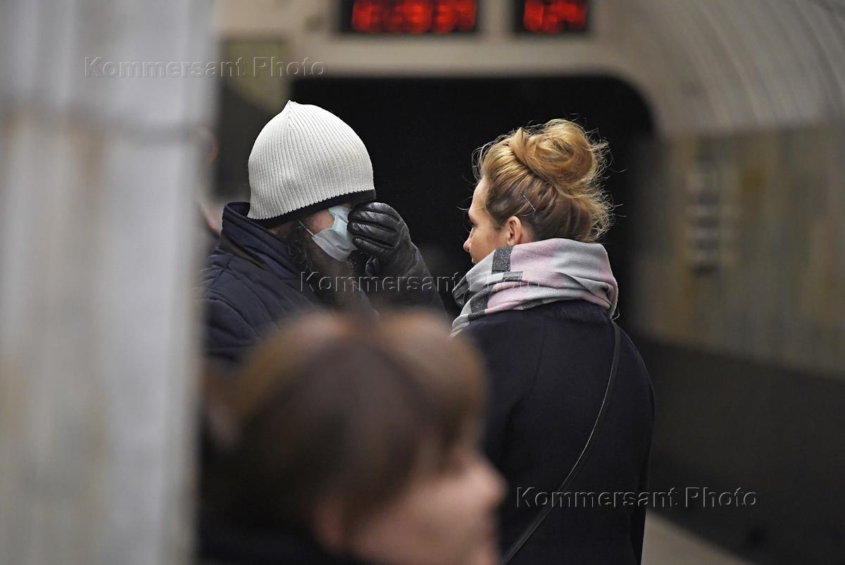 Preventive measures and precautions against coronavirus COVID-19. Genre photo. Passenger wearing face mask gestures at the Chekhovskaya metro station.