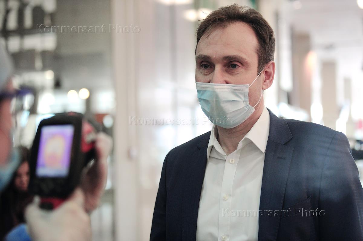 General Director of Tolmachevo Airport Evgeny Yankilevich wearing face mask attends a press conference.