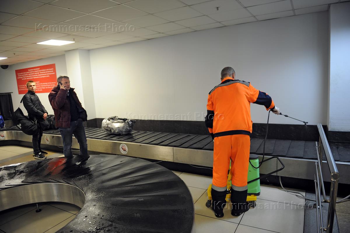 Preventive measures and precautions against coronavirus COVID-19. Genre photo. Disinfection of the luggage conveyor belt at the Tolmachevo airport.