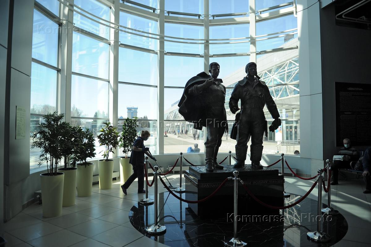 Preventive measures and precautions against coronavirus COVID-19. Genre photo. Airport employee performs sanitization at Tolmachevo airport.
