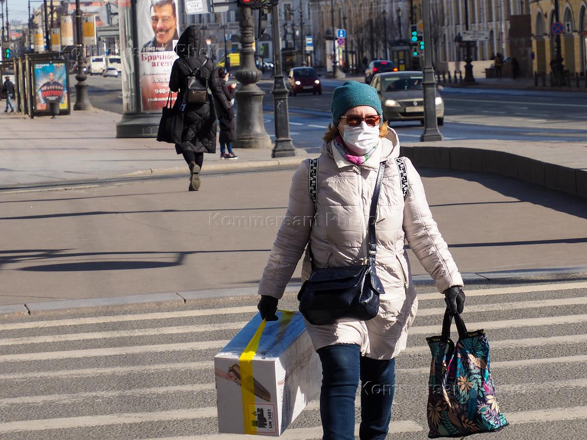 Views of St. Petersburg during Coronavirus COVID-19 Quarantine. Genre photo. Nevsky Prospect. People wearing face masks.