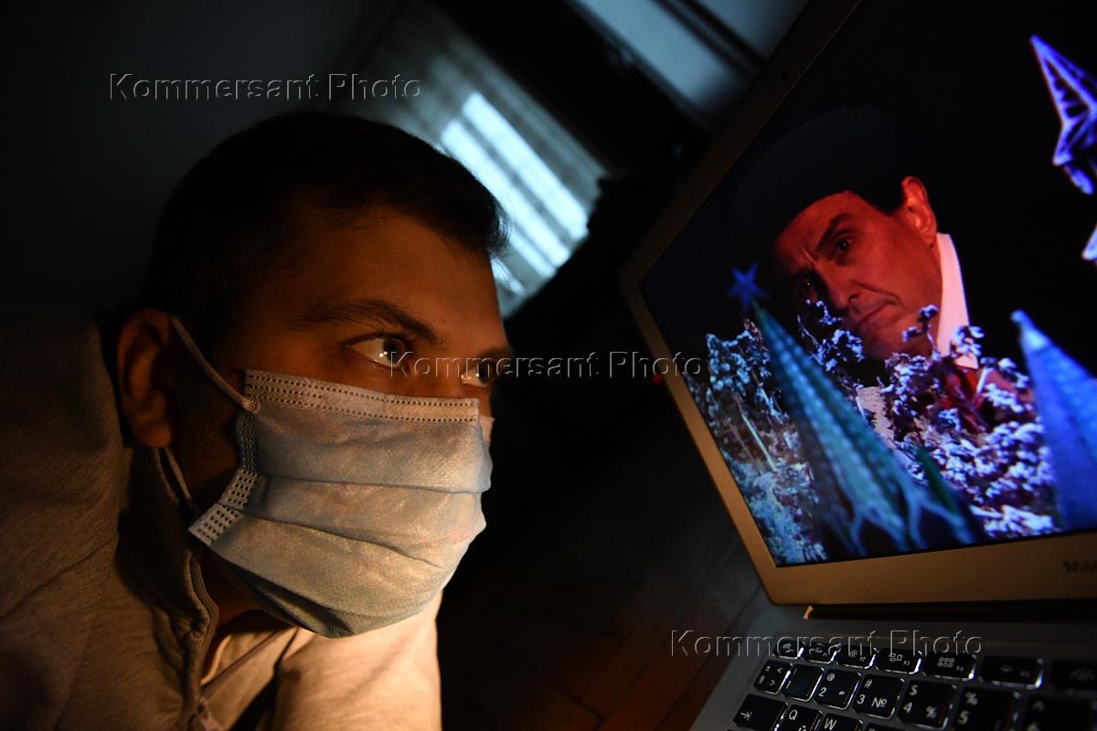 Genre photo. Live streaming of theatre shows during coronavirus COVID-19 quarantine and self-isolation regime. Live streaming of Chuk and Gek based on the short-story by Arkady Gaidar by staged by Mikhail Patlasov in the the Alexandrinsky Theater on a laptop screen.