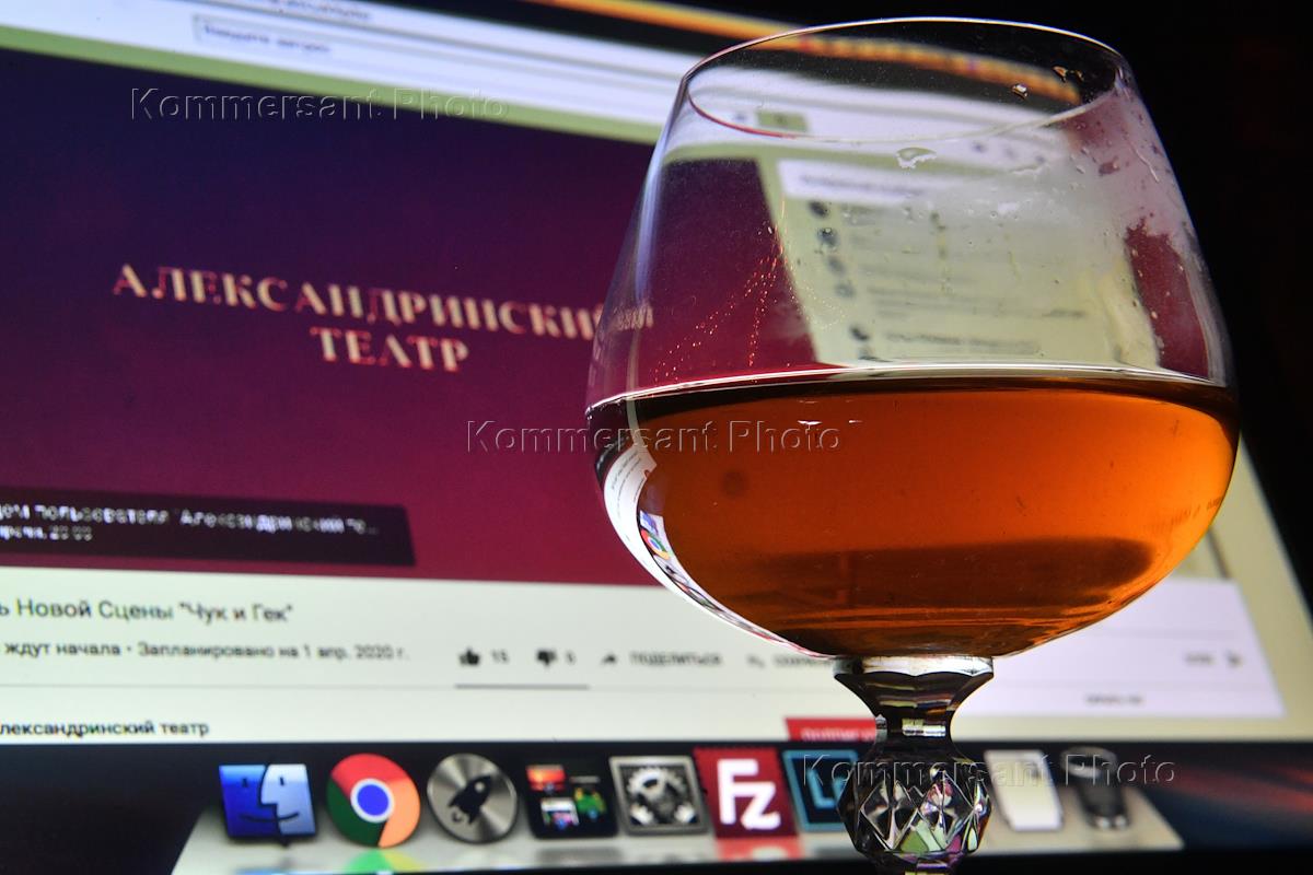 Genre photo. Live streaming of theatre shows during coronavirus COVID-19 quarantine and self-isolation regime. Live streaming of Chuk and Gek based on the short-story by Arkady Gaidar by staged by Mikhail Patlasov in the the Alexandrinsky Theater on a laptop screen.