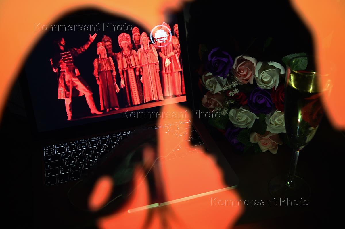 Genre photo. Live streaming of theatre shows during coronavirus COVID-19 quarantine and self-isolation regime. Live streaming of the The Tsar's Bride by Nikolai Rimsky-Korsakov staged by State Academic Bolshoi Theater on a laptop screen.