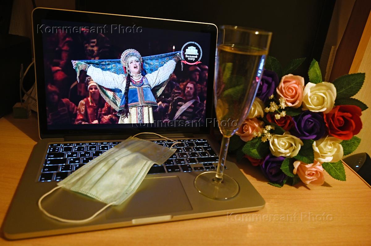 Жанровая фотография. Онлайн-трансляции театров во время карантина коронавируса COVID-19 и режима самоизоляции. Онлайн-трансляция оперы "Царская невеста" композитора Николая Римского-Корсакова в постановке Государственного академического Большого театра на экране ноутбука.