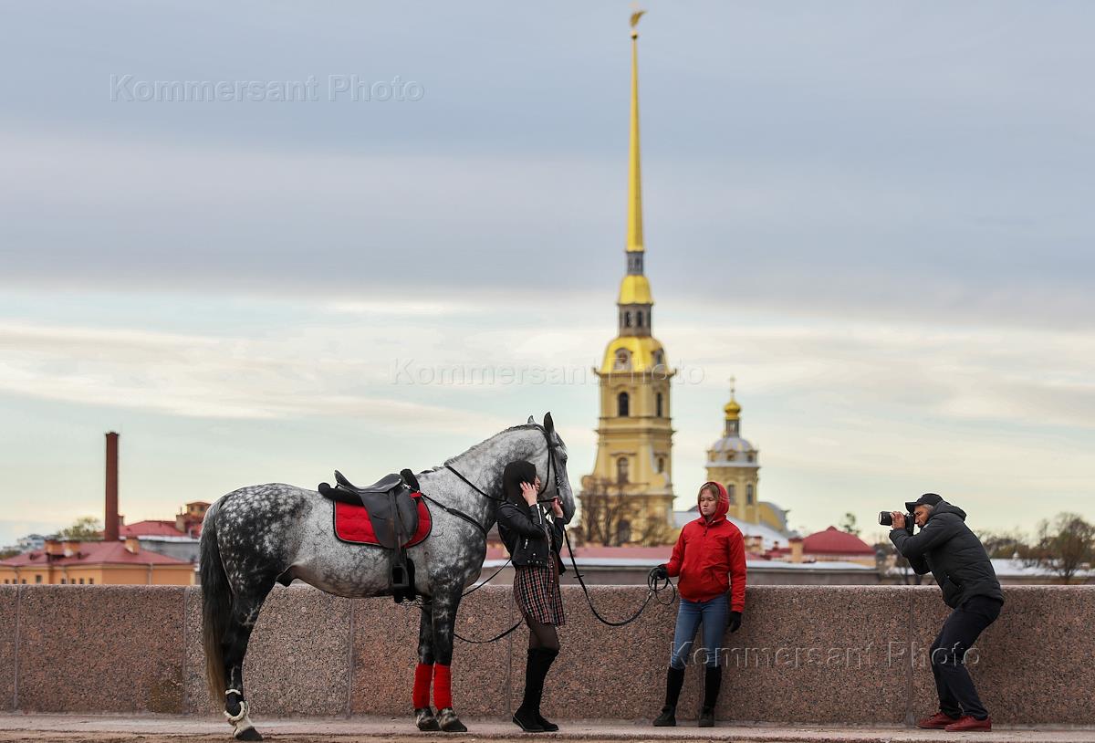 Санкт-Петербург во время режима самоизоляции из-за опасности распространения коронавирусной инфекции COVID-19. Жанровая фотография. Мужчина фотографирует с девушку с лошадью на стрелке Васильевского острова на фоне Петропавловского собора.