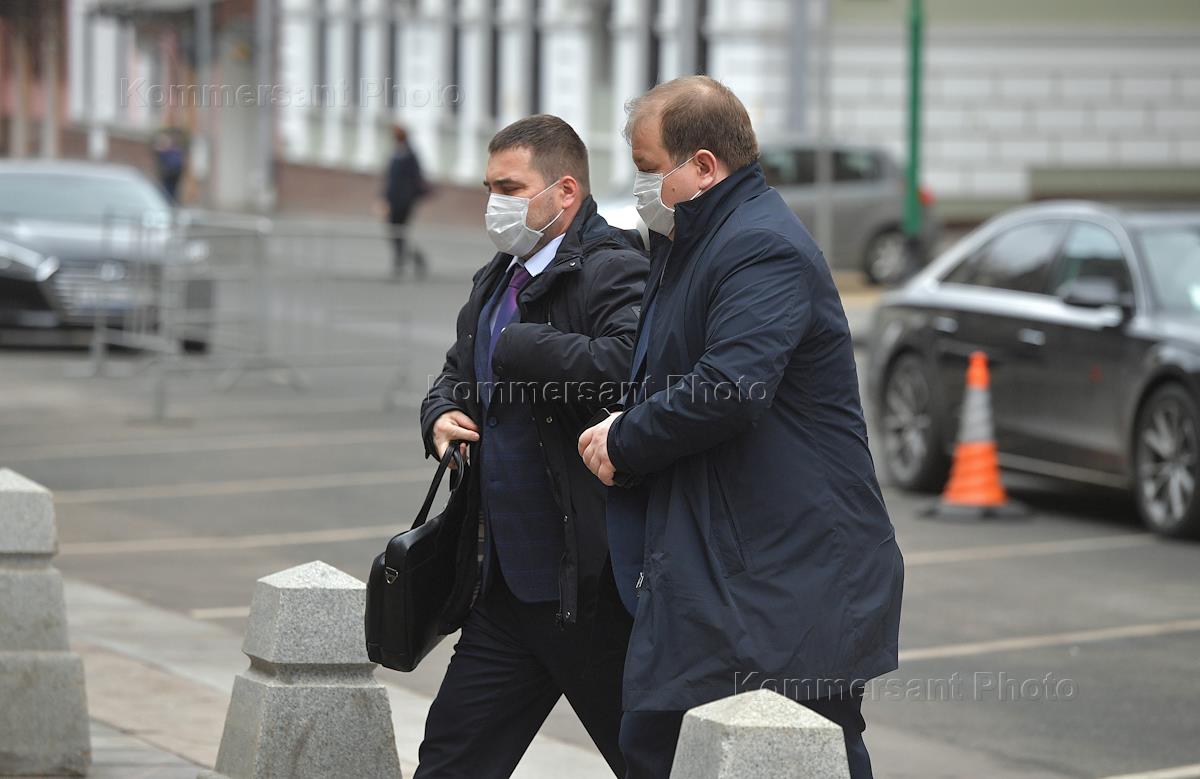 Views of Moscow during Coronavirus COVID-19 Quarantine. Members of the Federation Council of Russia arrive at the extraordinary plenary meeting. Chairman of the Federation Council Committee on Constitutional Legislation, Legal and Judicial Issues, Development of Civil Society, co-chairman of the working group on constitutional amendments Andrei Klishas (left) arrives at the meeting.