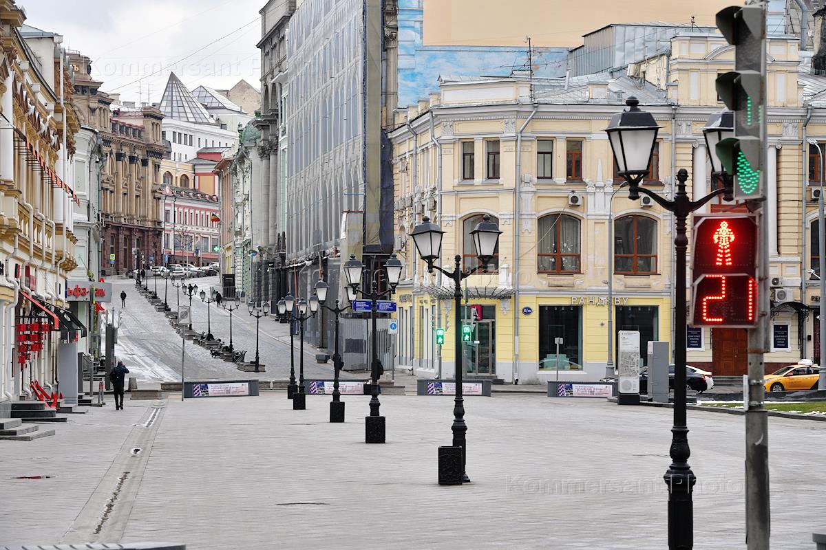 Виды Москвы во время карантина из-за опасности распространения коронавирусной инфекции COVID-19. Жанровая фотография. Пустынные улицы в центре города.
