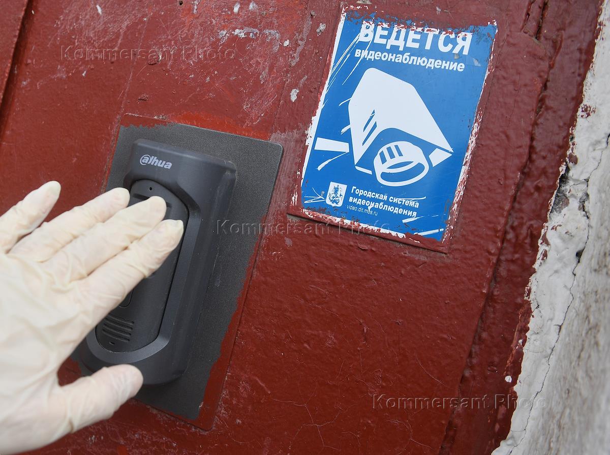 Views of Moscow during quarantine caused by the danger of the coronavirus COVID-19 spread. Genre photo. Hand in glove closes the lens of the security camera on the entrance door.