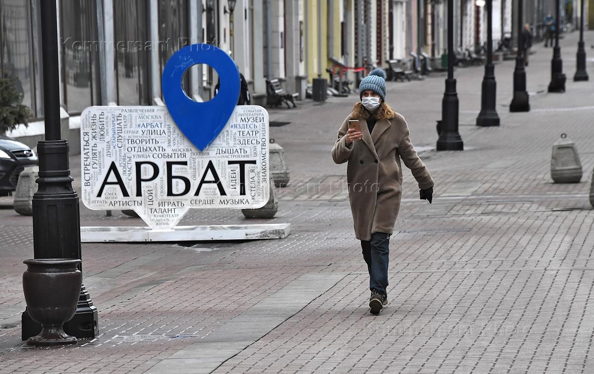 Views of Moscow during self-isolation regime caused by the danger of the coronavirus COVID-19 spread. Genre photo. Woman wearing face mask walks down Arbat street.