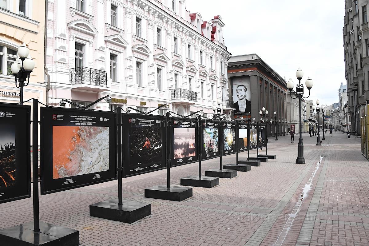 Views of Moscow during self-isolation regime caused by the danger of the coronavirus COVID-19 spread. Genre photo. Arbat street without a single passer-by.