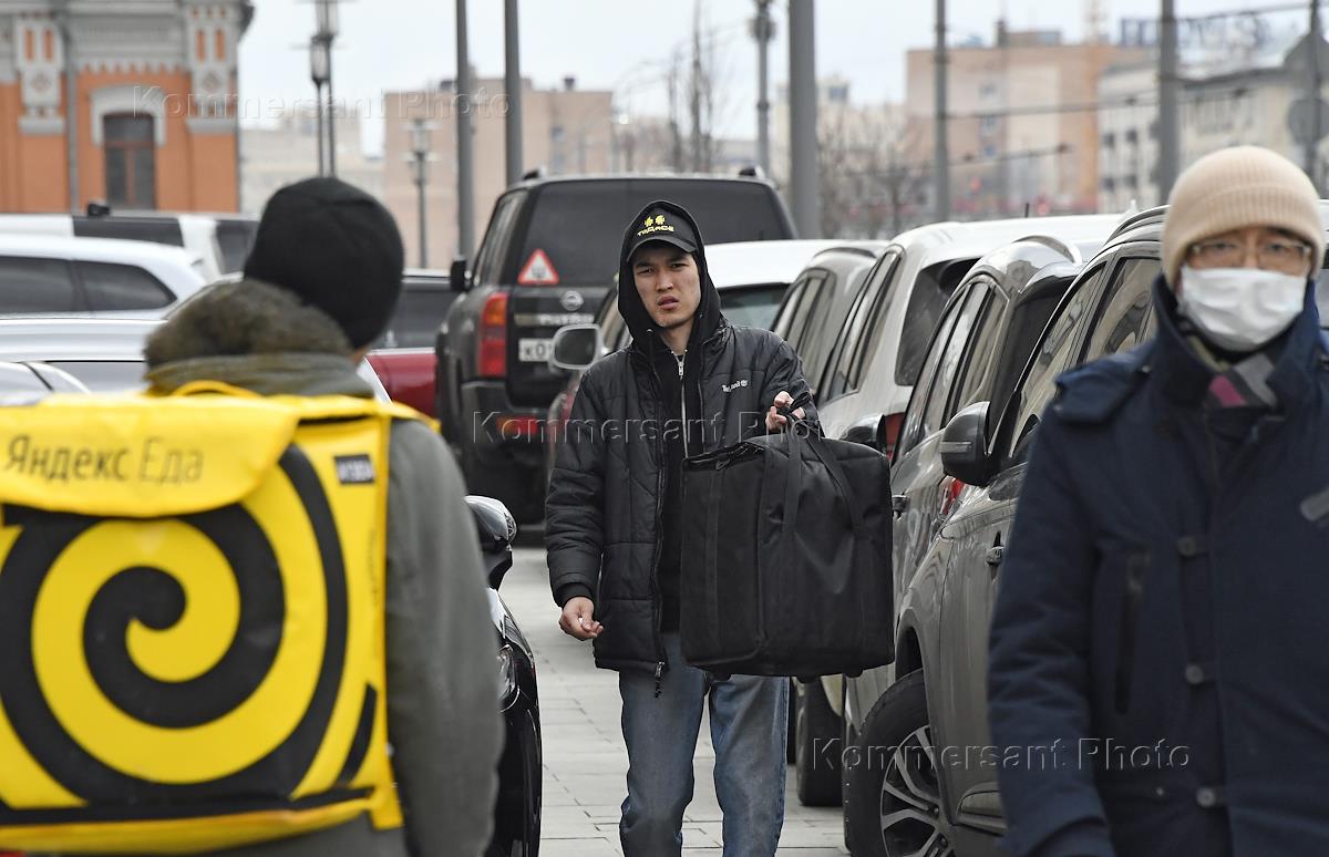 Views of Moscow during self-isolation regime caused by the danger of the coronavirus COVID-19 spread. Genre photo. Delivery service couriers walk down the street.