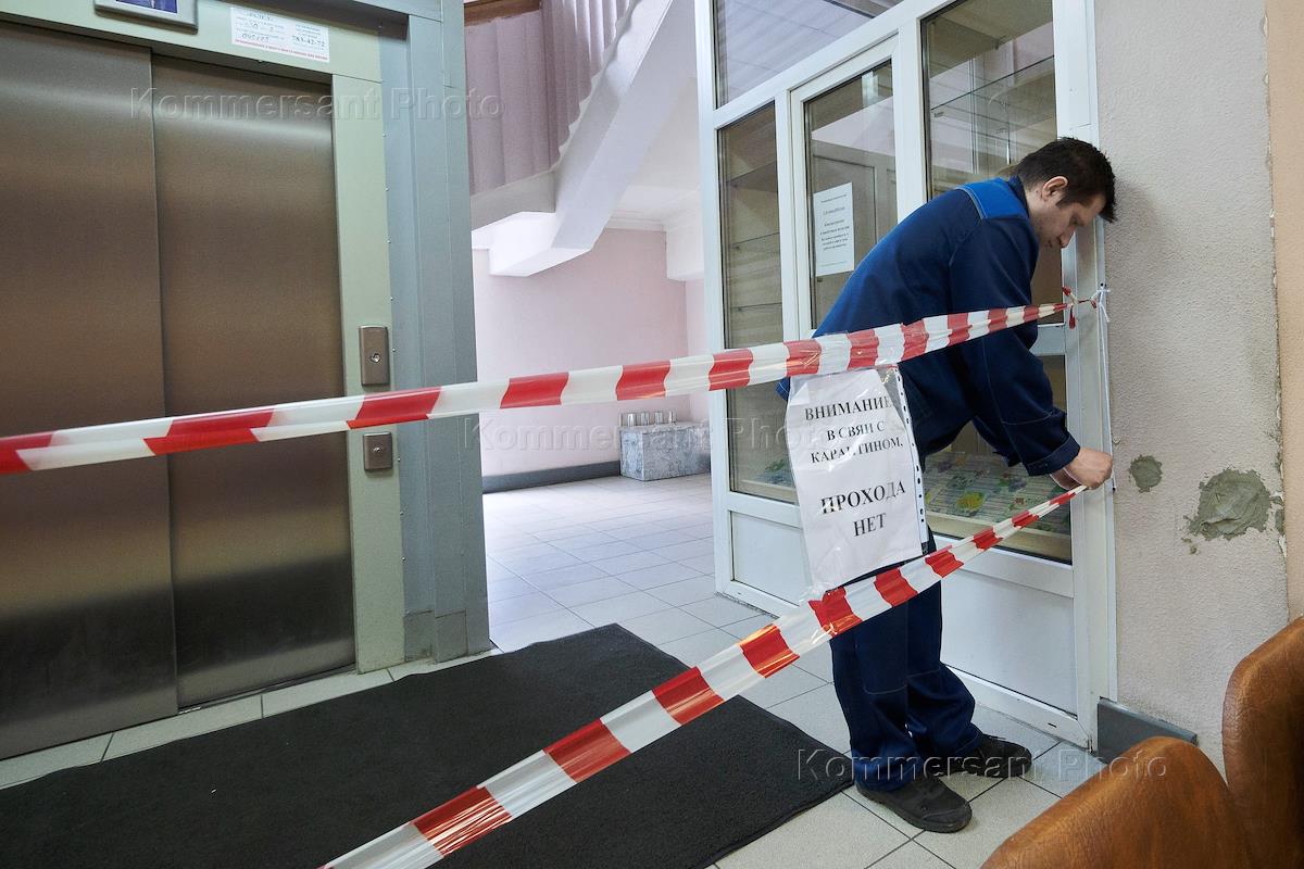 Меры предосторожности из-за опасности распространения коронавирусной инфекции COVOD-19. Жанровая фотография. Мужчина во время установки оградительной ленты и объявления "Прохода нет" в лифтовом холле здания.