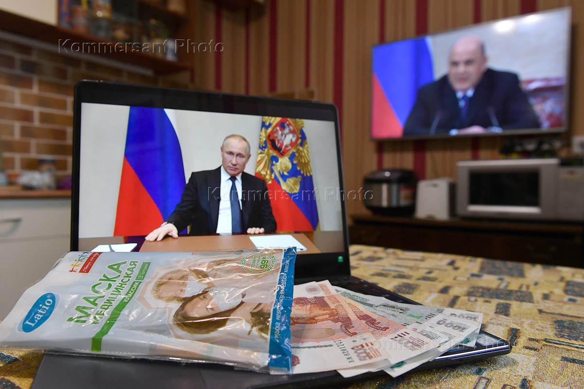 Genre photo. Broadcast of Russian President Vladimir Putin's speech on measures to prevent coronavirus COVID-19 spread.