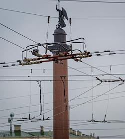 Санкт-Петербург во время режима самоизоляции из-за опасности распространения коронавирусной инфекцией COVID-19. Жанровая фотография. Александровская колонна на Дворцовой площади. Провода контактной сети троллейбусов.