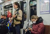 Санкт-Петербург во время режима самоизоляции из-за опасности распространения коронавирусной инфекцией COVID-19. Жанровая фотография. Музыкант во время выступления в вагоне метро.