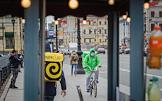 Санкт-Петербург во время режима самоизоляции из-за опасности распространения коронавирусной инфекцией COVID-19. Жанровая фотография. Курьеры службы доставки "Яндекс. Еда" и Delivery Club на велосипеде.