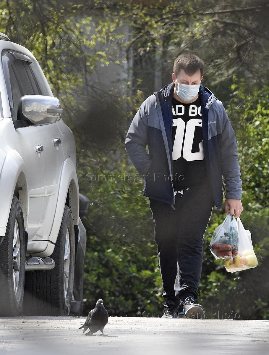 Виды Алушты во время режима карантина из-за угрозы распространения коронавирусной инфекции COVID-19. Жанровая фотография. Мужчина в медицинской маске с продуктами в сумках на улице.