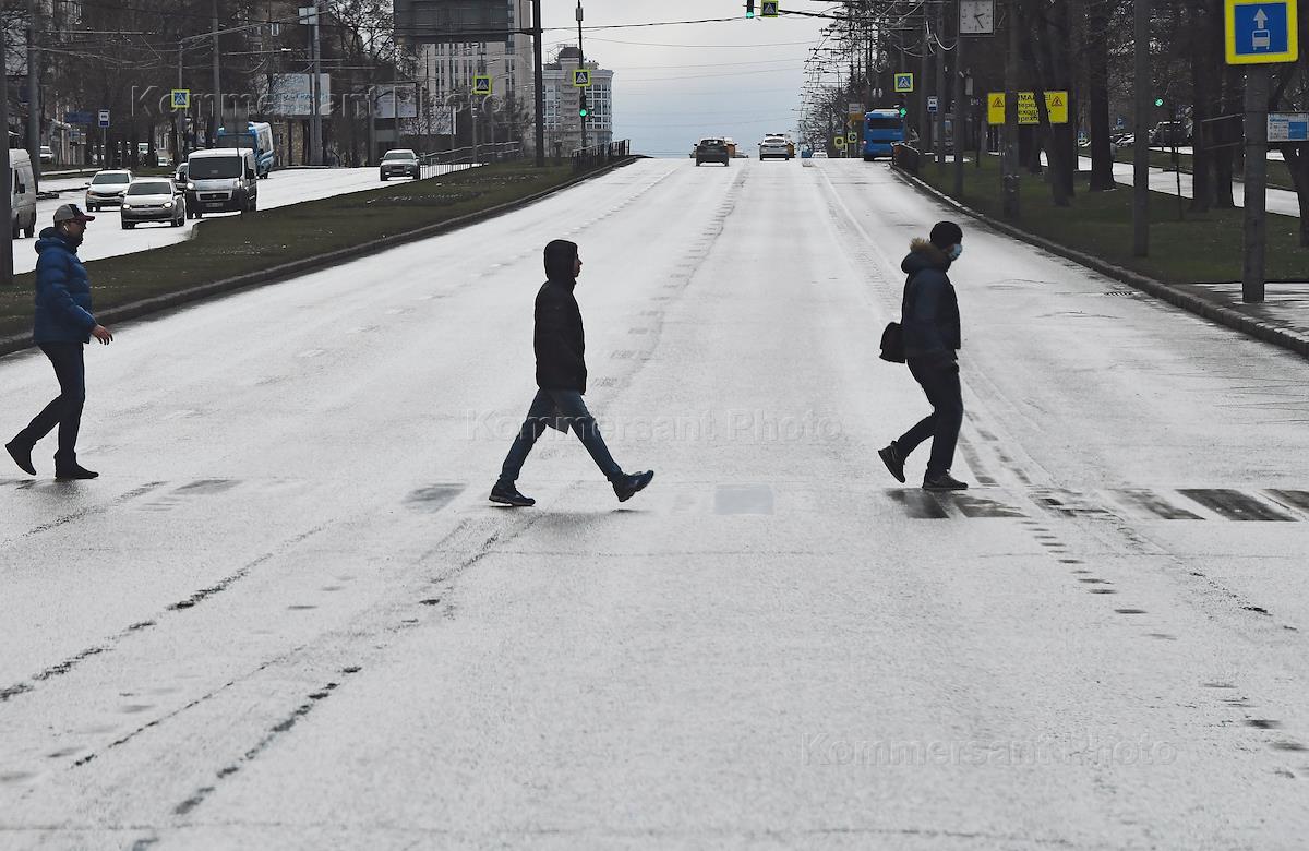 Виды Москвы во время режима самоизоляции из-за опасности распространения коронавирусной инфекции COVID-19. Жанровая фотография. Прохожие в медицинскиз масках идут по пешеходному переходу.