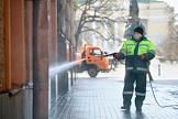 Санкт-Петербург во время режима самоизоляции из-за угрозы распространения коронавирусной инфекции COVID-19. Жанровая фотография. Мероприятия по обеззараживанию улиц.