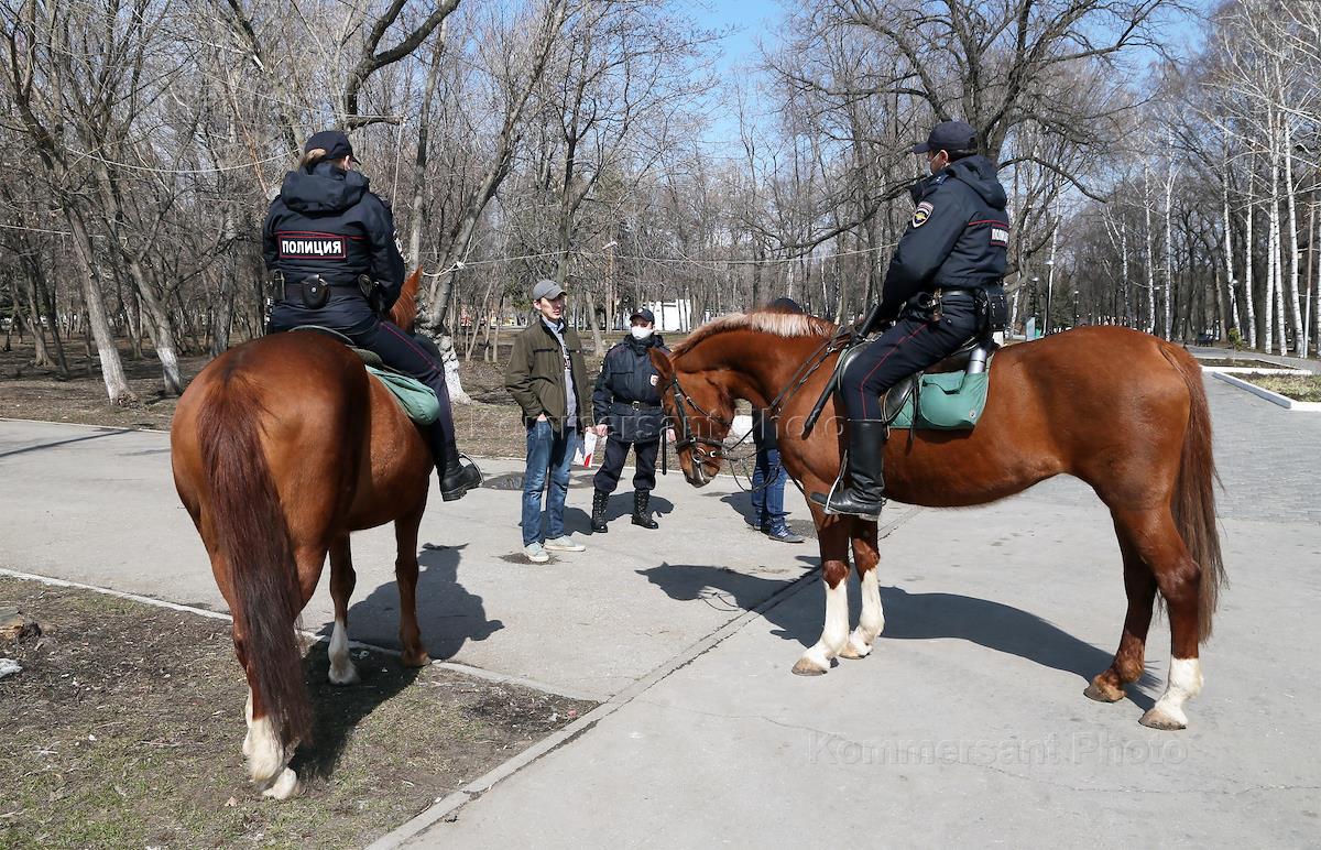 Самара во время режима самоизоляции из-за опасности распространения коронавируской инфекции COVID-19. Сотрудники конной полиции в самарском парке имени Юрия Гагарина проверяют документы у жительницы города.