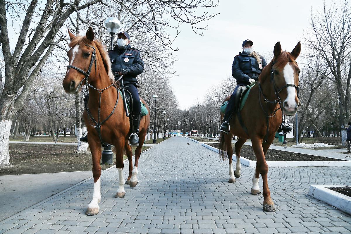 Самара во время режима самоизоляции из-за опасности распространения коронавируской инфекции COVID-19. Наряд конной полиции в самарском парке имени Юрия Гагарина.
