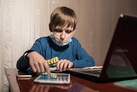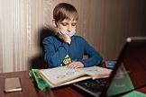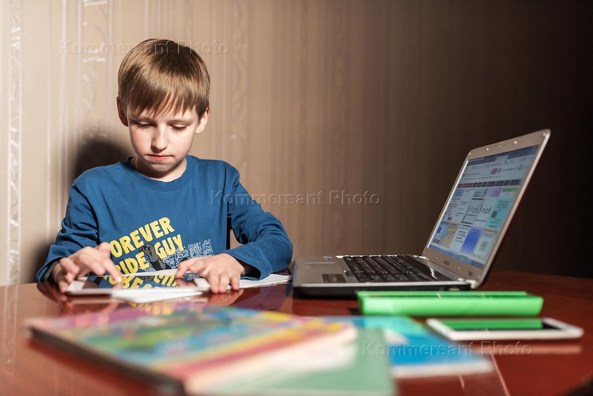 Меры предосторожности и профилактики против коронавируса COVID-19. Дистанционное домашнее обучение. Школьник во время выполнения домашних заданий.