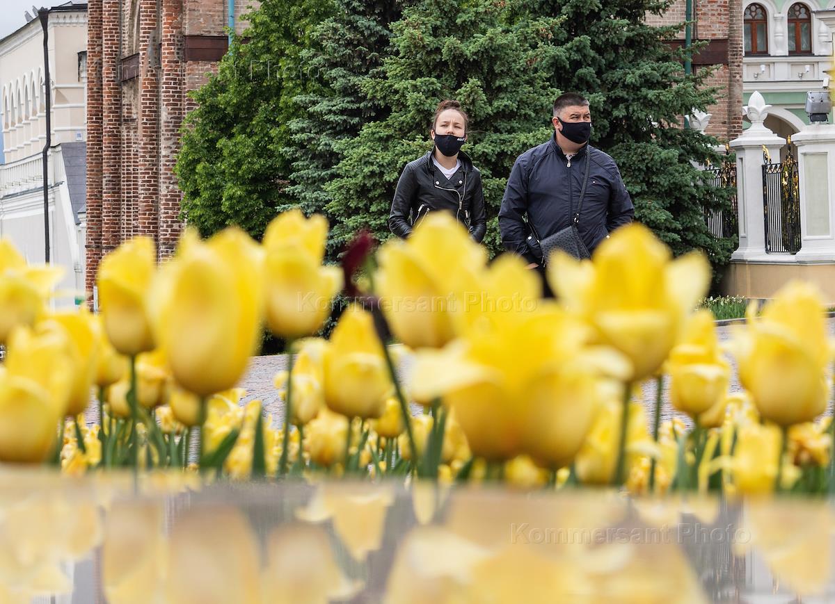 Казань во время режима самоизоляции из-за опасности распространения коронавирусной инфекции COVID-19. Снятие ограничений, введенных в связи с эпидемией коронавируса. Жанровая фотография. Люди в защитных медицинских масках гуляют по территории казанского кремля.
