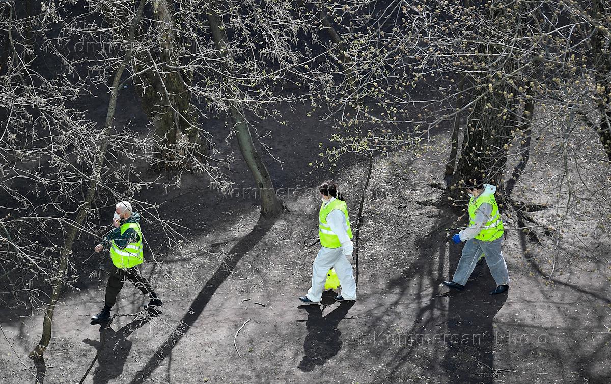 Виды Москвы во время режима самоизоляции из-за опасности распространения коронавирусной инфекции COVID-19. Жанровая фотография. Сотрудники муниципальных службы перед началом дезинфекции территории.