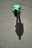 Москва во время режима самоизоляции из-за опасности распространения коронавирусной инфекции COVID-19. Жанровая фотография. Курьер службы доставки еды Delivery Club.