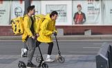 Виды Москвы во время режима самоизоляции из-за угрозы распространения коронавирусной инфекции COVID-19. Жанровая фотография. Курьеры службы доставки "Яндекс. Еда" едут на самокатах по улице.