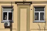 Виды Москвы во время режима самоизоляции из-за угрозы распространения коронавирусной инфекции COVID-19. Жанровая фотография. Женщина в медицинской маске моет окно.